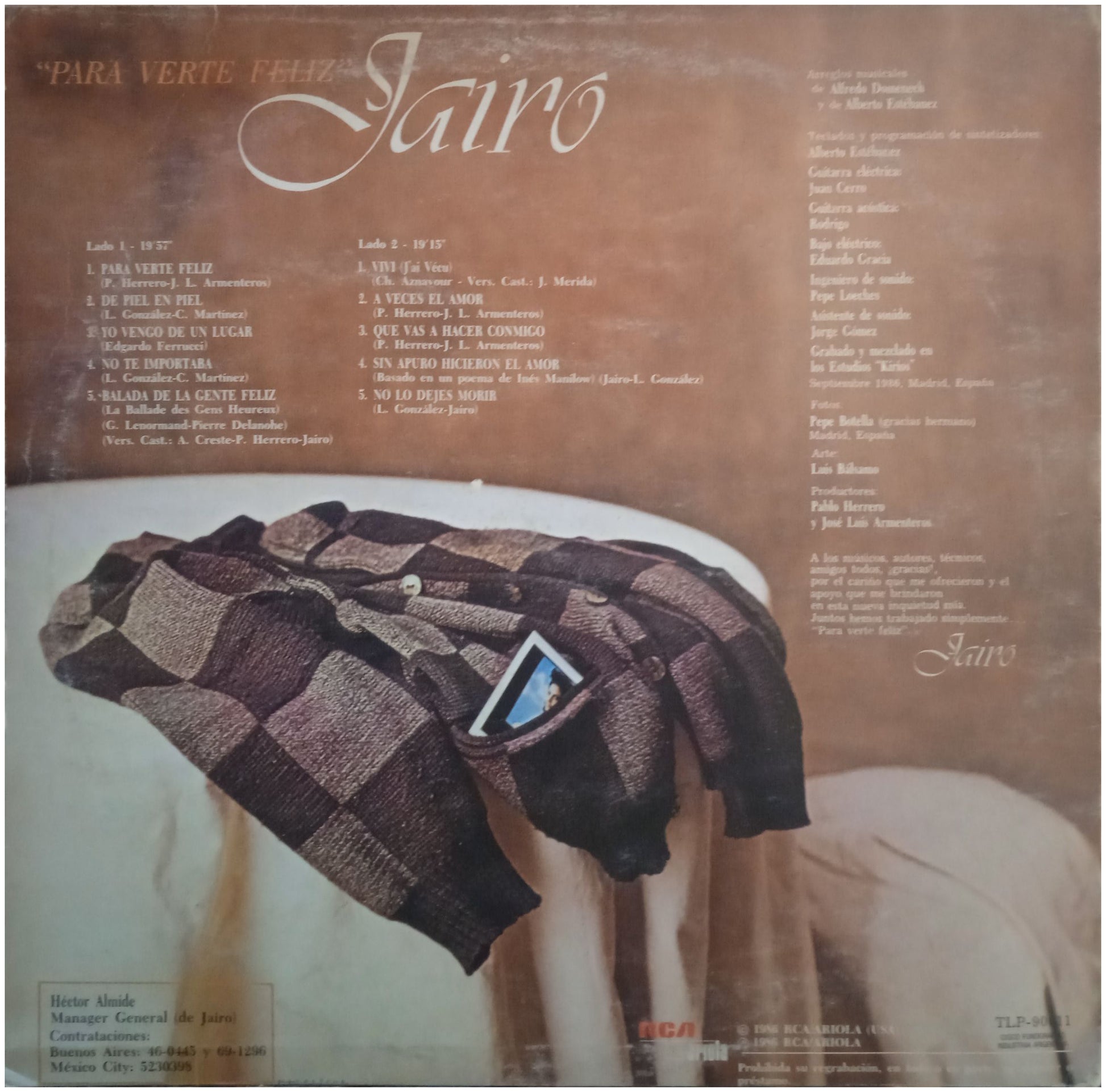 JAIRO - PARA VERTE FELIZ - EDICION ORIGINAL DE ARGENTINA DE 1986 - VINILO USADO EN EXCELENTES CONDICIONES (VG)