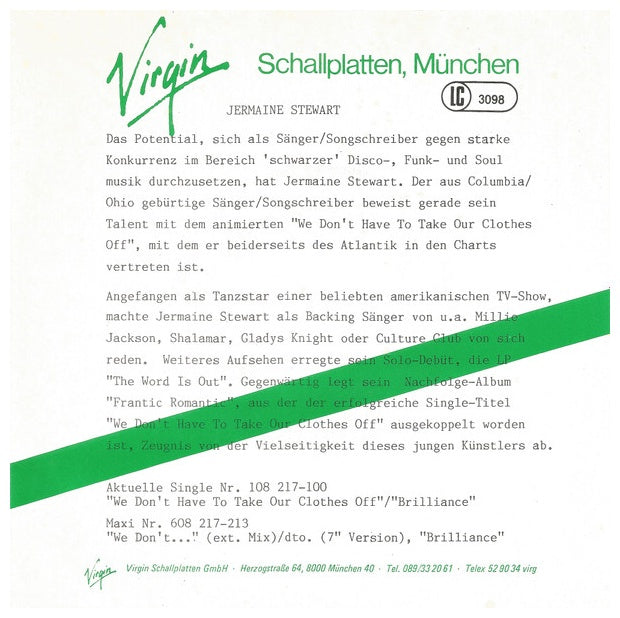 JERMAINE STEWART - WE DON'T HAVE TO TAKE OUR CLOTHES OFF - EDICIÓN ORIGINAL DE GERMANY DE 1986 - VINILO USADO EN EXCELENTES CONDICIONES (VG++)