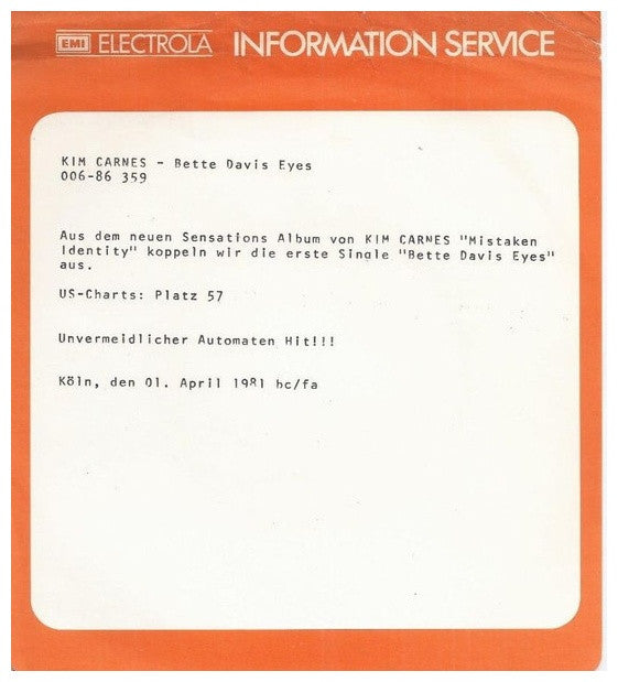 KIM CARNES - BETTE DAVIS EYES - EDICIÓN ORIGINAL DE GERMANY DE 1981 - VINILO USADO EN EXCELENTES CONDICIONES (VG++)